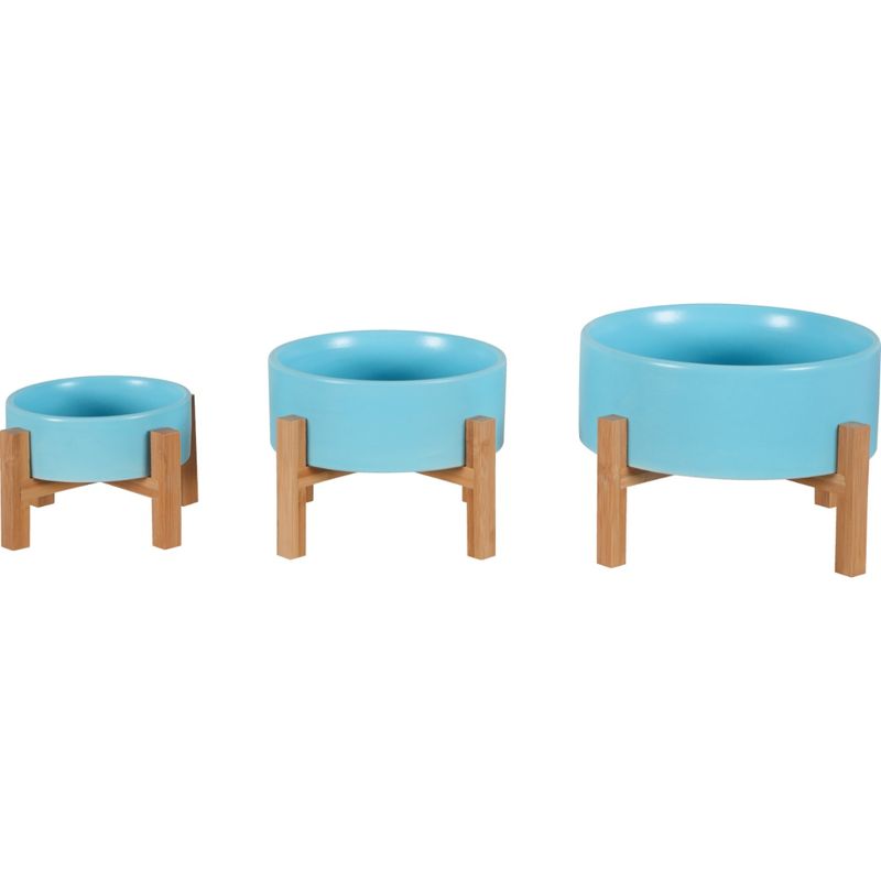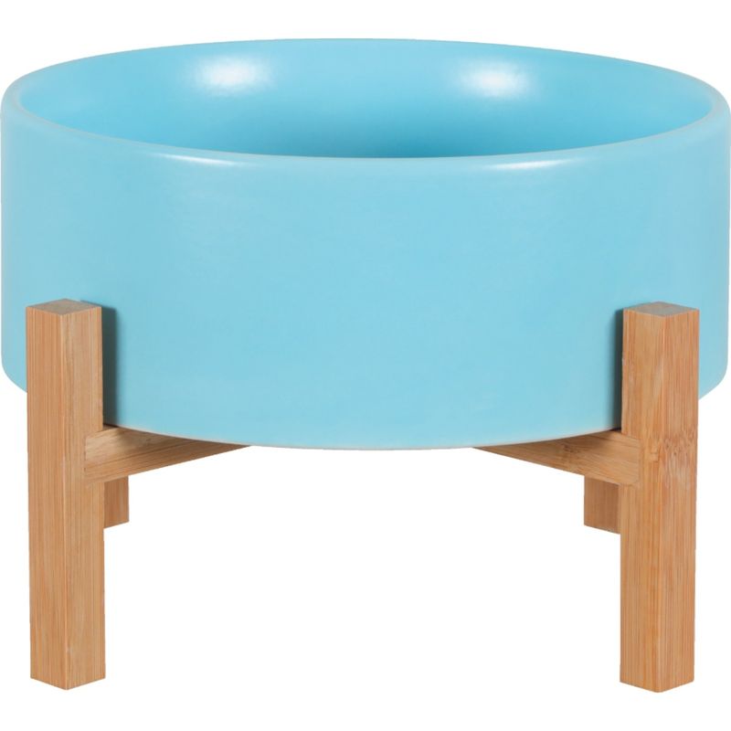 Ciotola per cani e gatti in ceramica di colore Azzurro con supporto in bambù ad altezza rialzata. Il prodotto è sollevato da terra grazie alla struttura in legno che conferisce stabilità alle scodelle, evitando spargimenti di cibo e/o liquido sul pavimento. Le alzatine favoriscono anche la postura del tuo animale permettendogli di mangiare più comodamente.