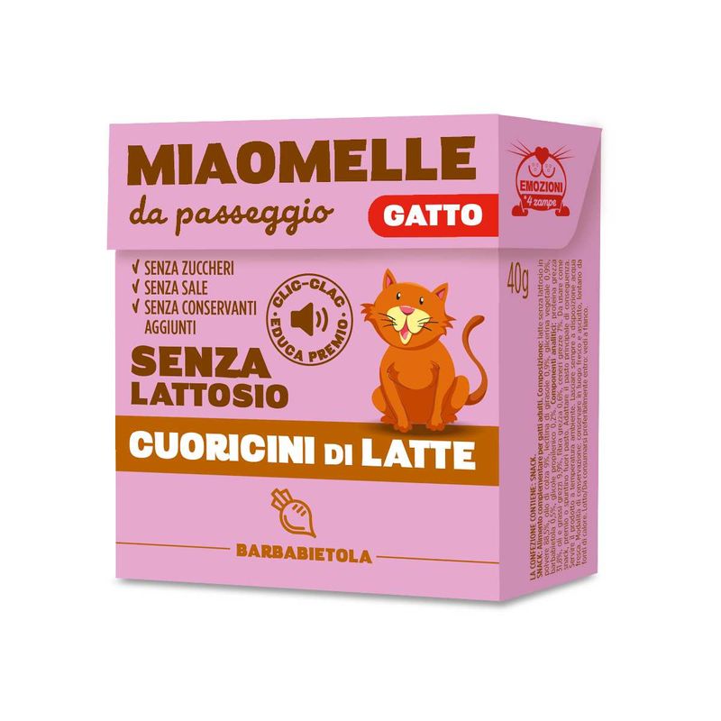 I Miaomelle Cuoricini di Latte sono irresistibili bocconcini pensati per gatti adulti di tutte le razze, ideali come ricompensa o spuntino fuori casa. Questi snack appartengono alla categoria snack secchi e si distinguono per la loro formula delicata, senza lattosio, quindi facilmente digeribile anche dai mici più sensibili. Oltre ad avere una forma divertente a cuore, sono senza zuccheri, senza sale e senza conservanti aggiunti, perfetti per un’alimentazione sana e bilanciata. La presenza della barbabietola, naturalmente ricca di antiossidanti e fibre, supporta il benessere intestinale e contribuisce a una buona vitalità quotidiana. I Cuoricini di Latte sono contenuti in un pratico astuccio con sistema clic-clac, pensato per educare e premiare anche fuori casa, in modo facile e veloce. Una coccola leggera, buona e genuina.