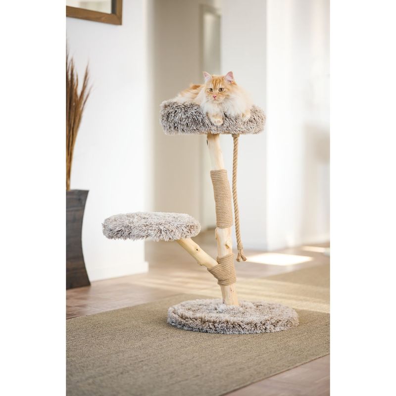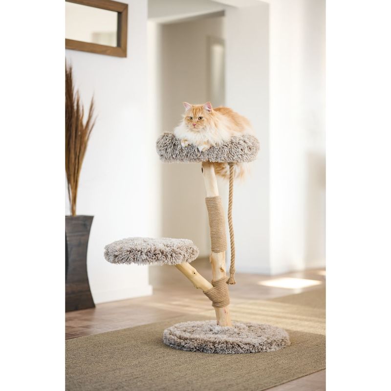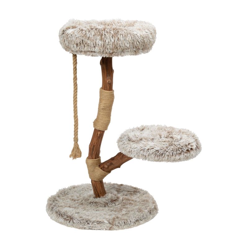 Il More Tiragraffi Kian è molto più di un semplice tiragraffi: è un vero e proprio centro benessere in legno naturale per il tuo gatto. Rientra nella categoria accessori per il riposo e il gioco ed è perfetto per gatti adulti di tutte le taglie. Realizzato in robusto legno di pero naturale, ogni struttura è unica, con venature e forme che variano leggermente da pezzo a pezzo. La struttura comprende superfici graffianti rivestite in juta resistente, ideali per soddisfare l’istinto naturale di affilare gli artigli. I due morbidi piani d'appoggio, rivestiti in peluche effetto pelliccia, offrono il massimo comfort per il riposo. E per rendere il tutto ancora più divertente, una corda in juta è fissata alla struttura per stimolare il gioco e l’interazione quotidiana. Un accessorio solido, stabile e dal look naturale, perfetto per armonizzarsi con l’arredamento di casa e regalare al tuo gatto uno spazio tutto suo dove arrampicarsi, graffiare, riposare e giocare.