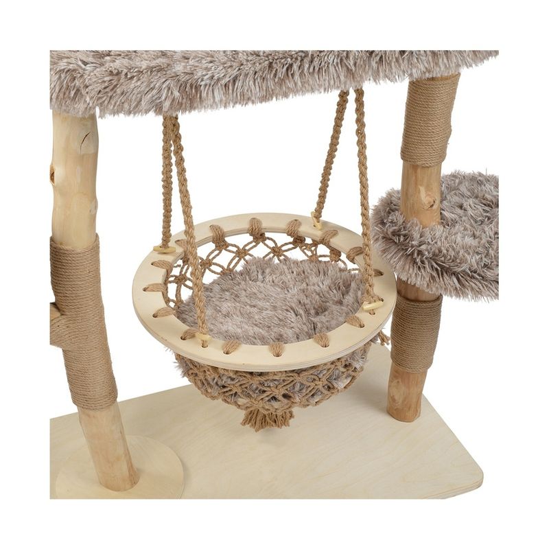 Il raffinato More Tiragraffi Liam è molto più di un semplice tiragraffi: è un vero e proprio centro benessere per gatti! Realizzato con tronchi in legno naturale, rivestimenti in morbida pelliccia sintetica e corda in sisal resistente, questo accessorio unisce estetica e praticità. Ideale per gatti adulti e cuccioli di tutte le taglie, offre spazi per riposare, arrampicarsi e giocare. La struttura è composta da più piattaforme accoglienti, una soffice cuccia panoramica e un'originale amaca sospesa in stile boho chic. Perfetto per soddisfare l’istinto naturale del gatto di graffiare, arrampicarsi e sorvegliare dall’alto, il tiragraffi Liam favorisce anche il relax e la stimolazione mentale. I materiali utilizzati sono resistenti ma delicati sulle unghie e sulle zampette, e ogni dettaglio è pensato per la sicurezza del tuo felino. Completamente privo di sostanze tossiche e realizzato con legno non trattato, è una scelta ecologica e sicura per la tua casa.