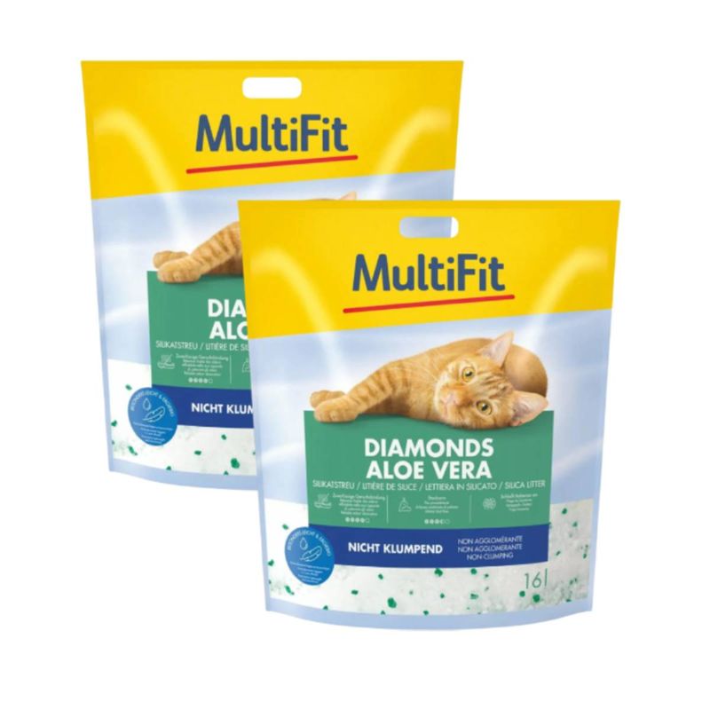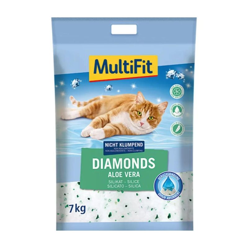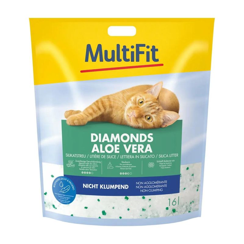 MultiFit Lettiera Diamonds Aloe Vera è una lettiera per gatti senza polvere, ad alte prestazioni e non agglomerante. La lettiera non agglomerante in sabbia di quarzo puro appositamente raffinata è per tutti i gatti, grandi e piccoli (da 6 settimane), con elevate esigenze di igiene quotidiana. La lettiera per gatti al silicio è caratterizzata da un assorbimento molto rapido di odori e umidità. La struttura porosa delle lettiere in silicio permette di assorbire una quantità di liquido pari al suo peso. Sviluppano poca polvere e hanno una resa alta. La potenza assorbente ultra forte assorbe l'urina in un lampo, intrappola in modo sicuro germi batterici e gli odori. L'umidità e gli odori vengono intrappolati in modo sicuro, la lettiera rimane asciutta al tatto. Riempire la lettiera del gatto con uno strato alto circa 6-8 cm. La lettiera sporca deve essere rimossa ogni giorno e sostituita con una nuova. Sostituire l'intera lettiera ogni 4 settimane circa, rendendola così anche meno dispendiosa oltre che efficace. Con il riscaldamento a pavimento mettere un materiale isolante sotto la lettiera, in legno o polistirolo sotto la lettiera. Questo previene gli odori che potrebbero derivare dal riscaldamento dei liquidi legati nei granuli. Se il tuo gatto non accettasse subito la nuova lettiera, sii paziente o mescola con la lettiera a cui è abituato per la prima volta.
