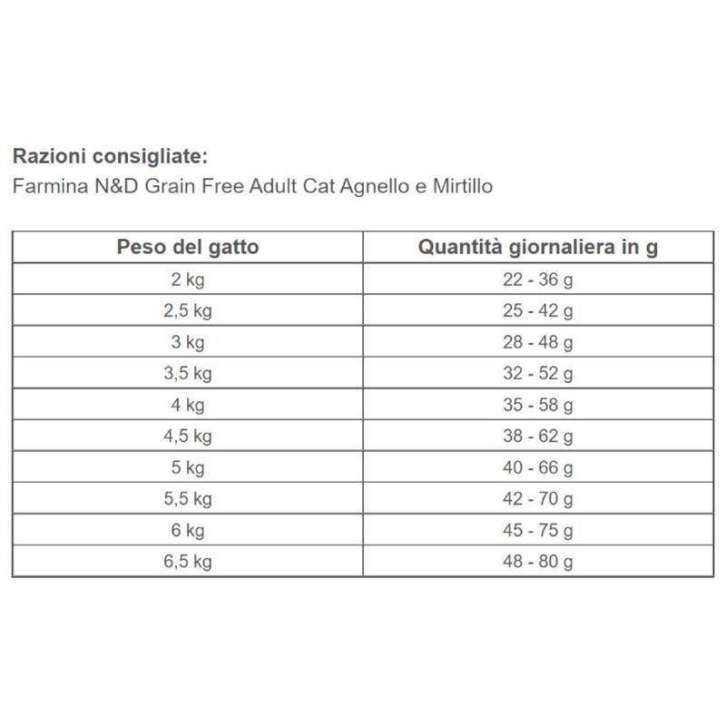 N&D Prime Gatto Adult Agnello Mirtillo è un alimento secco la cui ricetta soddisfa il fabbisogno nutrizionale naturale dei gatti adulti. La composizione naturale è composto da pregiati componenti di origine animale, ricchi di proteine, arricchito da frutta e verdura ed estratti vegetali, è un alimento di qualità premium bilanciato e ricco di micronutrienti e privo di cereali.