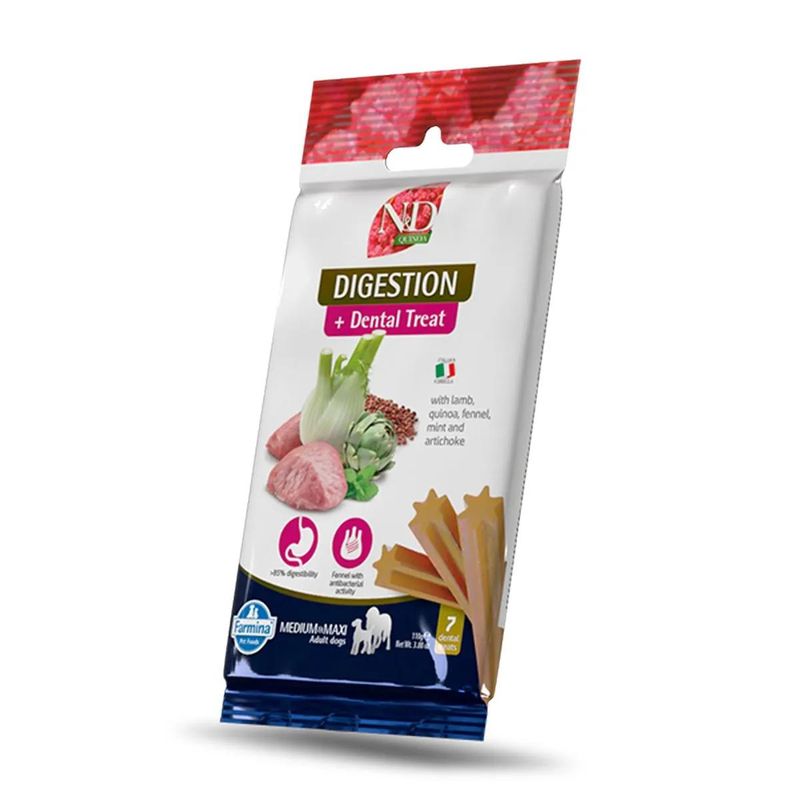 Offri al tuo cane un momento di piacere sano e funzionale con gli N&D Quinoa Snack Cane Medium e Maxi Digestion un sorriso fresco e sano con un occhio di riguardo alla digestione ottimale!