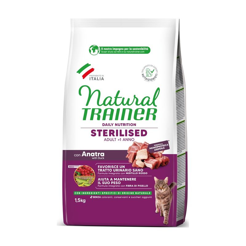 Natural Trainer Cat Sterilised Anatra si rinnova con nuovo pack e nuova formulazione. Potresti ricevere il nuovo o il vecchio pack in base alle disponibilità in magazzino.