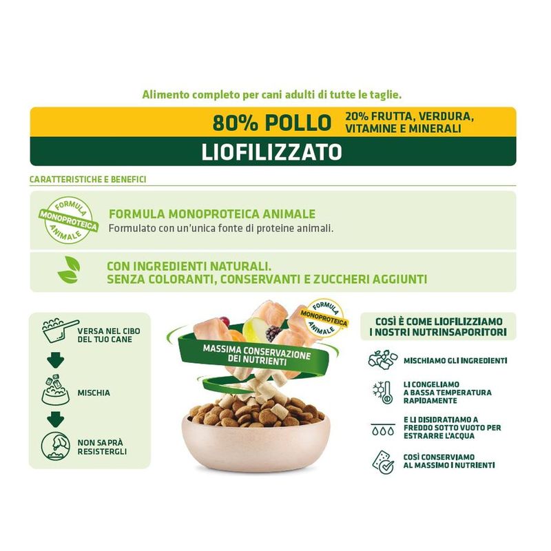 Natural Trainer Dog NutrInsaporitore 15G è un insaporitore formulato al 100% carne liofilizzata, sano e naturale dedicato al tuo cane adulto. Formulato con un’unica fonte di proteine animali. Contiene l'80% di carne e il 20% di frutta, verdura, vitamine e minerali, indispensabili per la salute del tuo amico peloso. Con ingredienti naturali, senza coloranti, conservanti e zuccheri aggiunti. Il processo della liofilizzazione avviene cosi: si tagliano tutti gli ingredienti presenti nella ricetta, dopo vengono congelati a bassa temperatura rapidamente, successivamente vengono disidratati a freddo sotto vuoto per estrarne l'acqua. Facendo così si conservano tutti i nutrienti degli ingredienti. Questo insaporitore è un modo per rafforzare il legame tra te e il tuo amico peloso. Può essere usato come ricompensa o come coccola tra un pasto e l’altro.