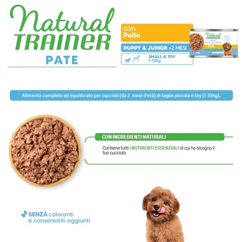 Cibo umido per cani con pollo Natural Trainer Puppy & Junior per cuccioli di piccola e piccolissima taglia da 1 a 10 Kg di peso, aiuta a ridurre il cattivo odore delle feci.
