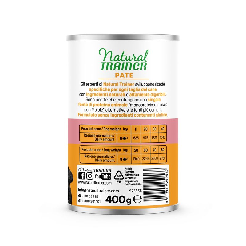 Attenzione: Natural Trainer Monoproteico Dog Lattina 400G si rinnova con nuovo packaging ma la ricetta rimane la stessa. Potresti ricevere il nuovo o il vecchio pack a seconda della disponibilità a magazzino.