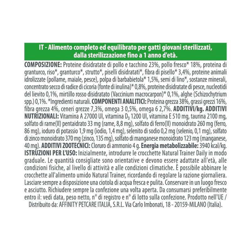 Natural Trainer è un brand che si distingue per la sua combinazione unica di natura e scienza, con l'obiettivo di offrire ai nostri amici felini un'alimentazione sana, completa e gustosa. Con ingredienti selezionati e un approccio scientifico nella formulazione dei prodotti, Natural Trainer si dedica a garantire il benessere dei gatti, creando alimenti bilanciati che rispondono alle loro specifiche esigenze nutrizionali. Il team di esperti nutrizionisti lavora costantemente per assicurarsi che ogni ricetta sia di altissima qualità e studiata per ogni fase della vita del gatto.