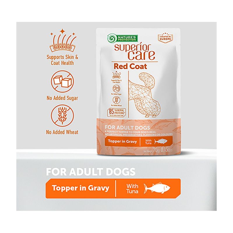 Fai risplendere il mantello del tuo amico a quattro zampe con il Nature's Protection Superior Care Red Coat Dog Busta Multipack 24x70G: un'esplosione di gusto e colore ad ogni pasto!