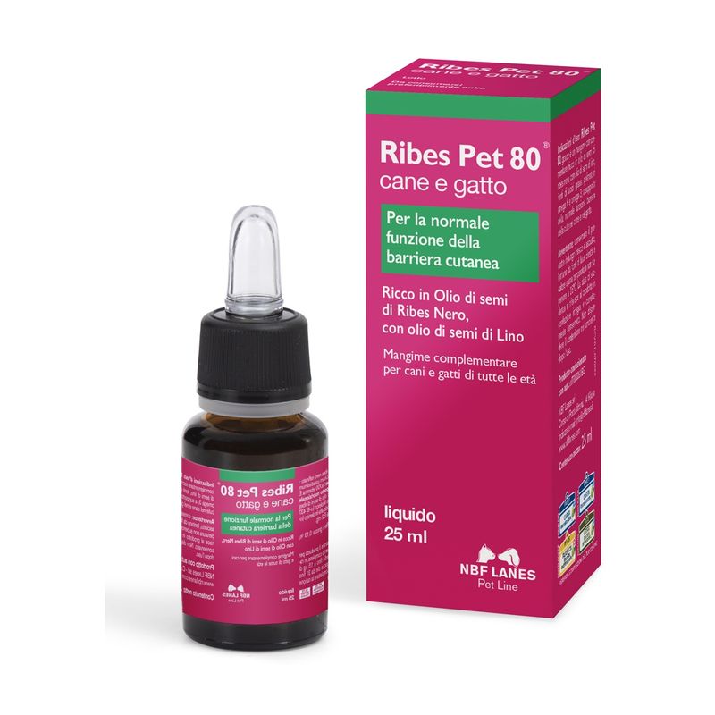 Ribes Pet 80 Mangime Complementare Cani e Gatti pensato per supportare la funzione dermica di cani e gatti, in particolare in caso di dermatosi e perdita eccessiva di peli. Grazie all'alta concentrazione di acidi grassi essenziali provenienti dall'olio di semi di ribes nero, aiuta a rinforzare la funzione barriera della pelle, favorendo il benessere cutaneo del tuo animale. Questo prodotto è ideale per cani e gatti di tutte le età e rappresenta un valido coadiuvante nel trattamento di problematiche cutanee, mantenendo la pelle sana e riducendo la perdita di pelo.