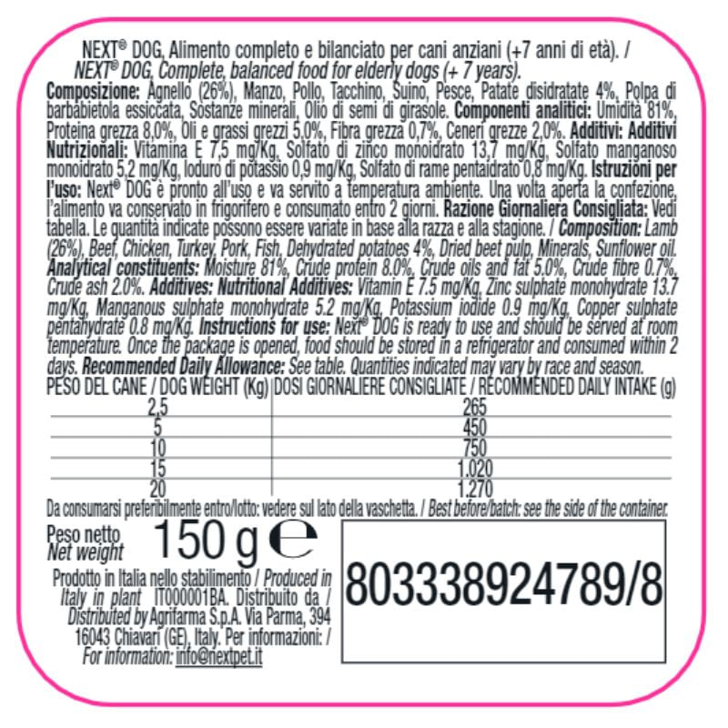 Next Dog Senior Vaschetta Multipack 22x150G è un alimento umido completo e bilanciato in vaschetta per cani anziani di tutte le taglie e razze. Questo alimento è stato sapientemente formulato da esperti nutrizionisti che hanno combinato ingredienti di prima qualità, accuratamente selezionati, per garantire al tuo cane anziano il miglior apporto nutrizionale possibile, tenendo conto dell'avanzare dell'età. Questo alimento senza coloranti e conservanti contiene un'elevato tenore di carne di agnello che garantisce un gusto prelibato che soddisferà il palato del tuo cane anziano, mentre l'apporto di preziosi nutrienti e proteine naturali lo aiuterà a mantenere la vitalità e il benessere anche negli anni avanzati.