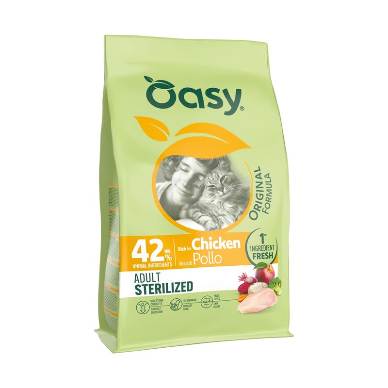 Fai felice il tuo micio ogni giorno con Oasy Cat Adult Sterilized Original Formula Pollo: la sua ciotola sarà sempre una festa di gusto e benessere!
