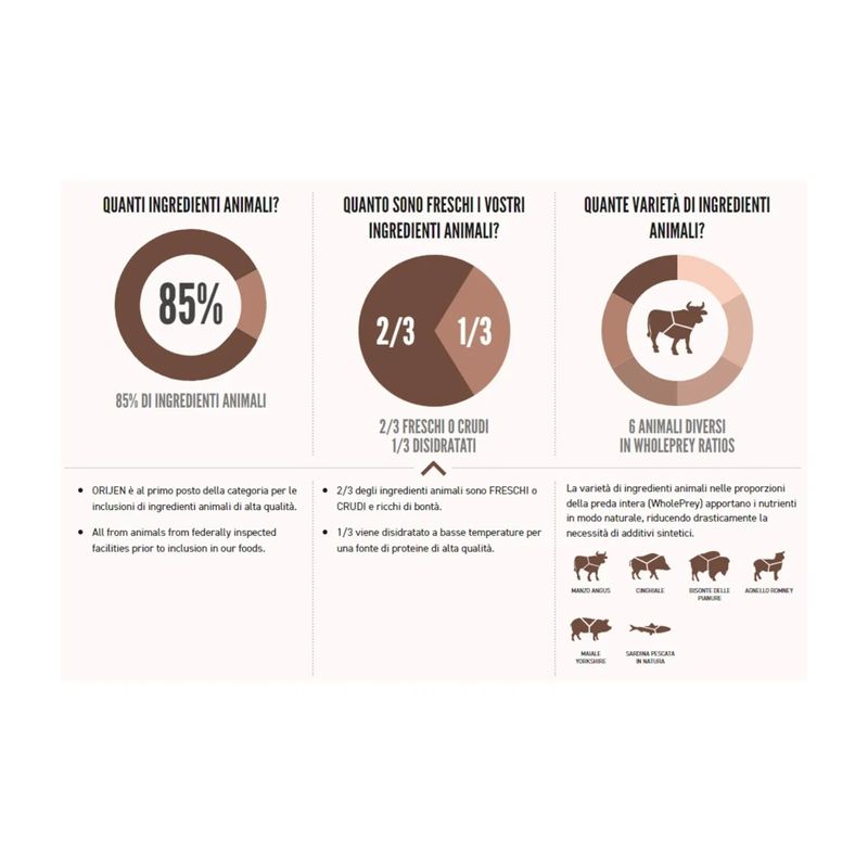 ORIJEN sceglie d'impiegare componenti nutrizionali locali ottenuti con pratiche sostenibili, carni non allevate industrialmente e frutta e verdura consegnate fresche e prive di conservanti, per mantenere intatta la loro originaria bontà. Tutti gli ingredienti sono Human Grade, ovvero adatti al consumo umano e Grain Free, ossia le ricette elaborate contengono una bassa quantità di cereali, difficilmente digeribili da cani e gatti.