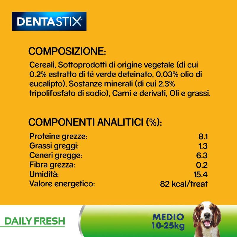 I cani utilizzano la bocca per ogni attività, quindi è essenziale che abbiano gengive e denti sani per una vita piena e attiva. Tuttavia, 4 cani su 5 di età superiore ai 3 anni soffrono di disturbi gengivali, che possono ridurre la loro vitalità e richiedere l'intervento di un esperto. Pedigree Dentastix Daily Fresh Dog Medium è lo snack dentale ideale per cani di media taglia, tra i 10 e i 25 kg, progettato per una corretta igiene orale con tripla azione +, scientificamente provata. Questo snack aiuta a ridurre la formazione del tartaro fino all'80%, pulisce i denti più difficili da raggiungere e contribuisce a mantenere gengive sane. Pur essendo saporito, ha un basso contenuto di grassi e non contiene zuccheri aggiunti, coloranti o aromi artificiali. Studiati per essere masticati a lungo e risultare efficaci, questi snack contengono ingredienti attivi che riducono la placca e il tartaro. Inoltre, grazie a una miscela speciale di estratto di tè verde e olio essenziale di eucalipto, contribuiscono a mantenere fresco l'alito del tuo cane.