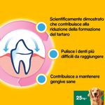 Pedigree Dentastix Daily Oral Care Large Dog Multipack 21PZ è lo snack dentale ideale per cani di taglia grande, a partire dai 25 kg, progettato per una corretta igiene orale con tripla azione +, scientificamente provata. Questo snack aiuta a ridurre la formazione del tartaro fino all'80%, pulisce i denti più difficili da raggiungere e contribuisce a mantenere gengive sane. Pur essendo saporito, ha un basso contenuto di grassi e non contiene zuccheri aggiunti, coloranti o aromi artificiali. Studiati per essere masticati a lungo e risultare efficaci, questi snack contengono ingredienti attivi che riducono la placca e il tartaro. Inoltre, la particolare forma a X di questi sticks favorisce una masticazione efficace, contribuendo a raggiungere anche i punti più difficili dei denti per una pulizia ottimale.