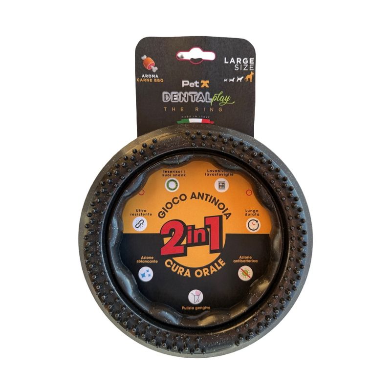 Il Pet X Gioco Cane Dental Play The Ring Large è molto più di un semplice passatempo: è un gioco masticativo ad alta resistenza pensato per cani adulti di taglia grande, progettato per unire cura orale e stimolazione mentale in un’unica esperienza. Realizzato con uno speciale polimero elastomerico ultra resistente, offre ore di masticazione sicura, aiutando il cane a sfogare energia, combattere la noia e sviluppare le capacità cognitive. All’interno, aromi al gusto carne BBQ e fessure dedicate per inserire snack solidi o semi-solidi stimolano l’olfatto e mantengono viva l’attenzione. La sua struttura è studiata per la pulizia delle gengive, grazie a piccoli rilievi che svolgono un’azione meccanica contro placca e tartaro. Inoltre, è arricchito con ossido di zinco dalle proprietà antibatteriche, che aiuta a contrastare l’alito cattivo, e con carbonato di calcio, che agisce con una leggera azione abrasiva per una naturale azione sbiancante. Un gioco 2 in 1 che si prende cura del tuo cane mentre si diverte!