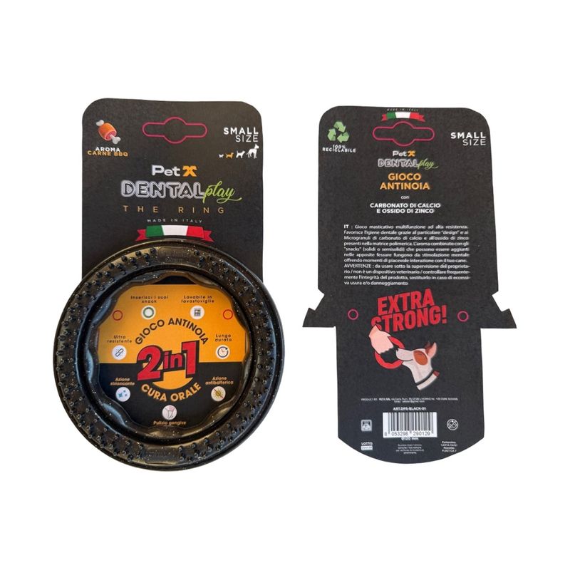 Il Pet X Gioco Cane Dental Play The Ring Small è molto più di un semplice passatempo: è un gioco masticativo ad alta resistenza pensato per cani adulti di taglia piccola, progettato per unire cura orale e stimolazione mentale in un’unica esperienza. Realizzato con uno speciale polimero elastomerico ultra resistente, offre ore di masticazione sicura, aiutando il cane a sfogare energia, combattere la noia e sviluppare le capacità cognitive. All’interno, aromi al gusto carne BBQ e fessure dedicate per inserire snack solidi o semi-solidi stimolano l’olfatto e mantengono viva l’attenzione. La sua struttura è studiata per la pulizia delle gengive, grazie a piccoli rilievi che svolgono un’azione meccanica contro placca e tartaro. Inoltre, è arricchito con ossido di zinco dalle proprietà antibatteriche, che aiuta a contrastare l’alito cattivo, e con carbonato di calcio, che agisce con una leggera azione abrasiva per una naturale azione sbiancante. Un gioco 2 in 1 che si prende cura del tuo cane mentre si diverte!