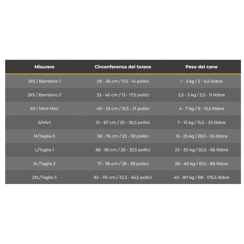 Vedere la tabella immagini per identificare la misura corretta che corrisponde alla circonferenza del torace e al peso del cane.