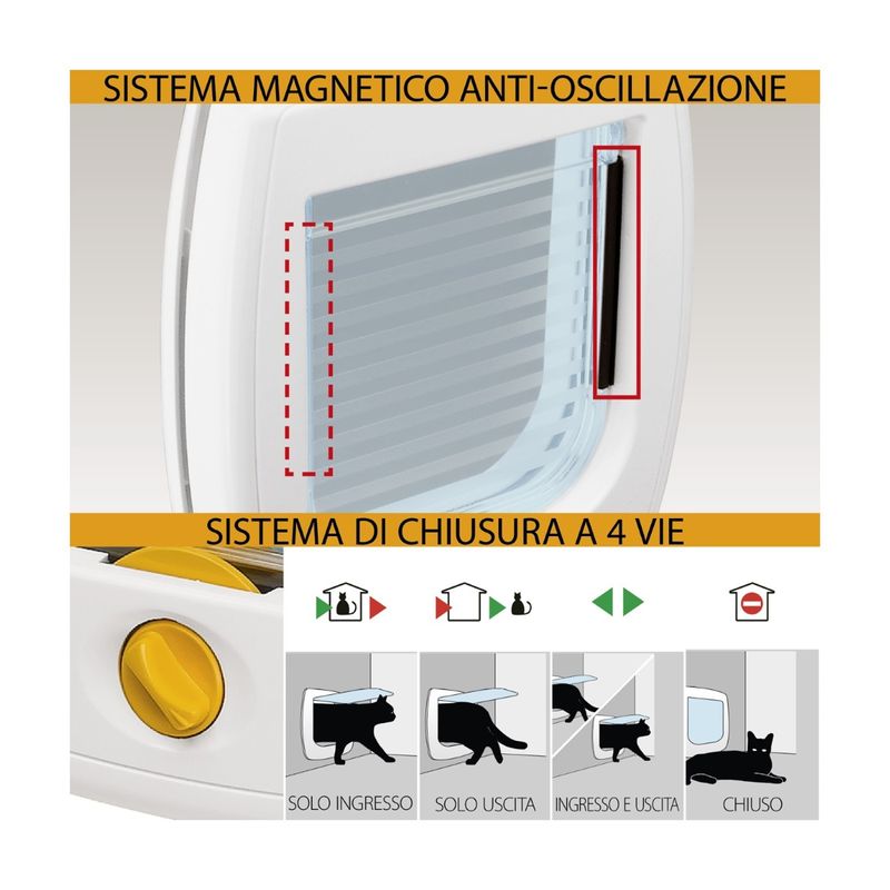 La Porta Basculante Swing 3 Basic Bianca è la soluzione ideale per gatti e cani di piccola taglia, realizzata in robusta plastica per garantire resistenza e durata nel tempo. Questa portina versatile può essere facilmente installata su porte in legno, metallo, vetro e persino su pareti in muratura, offrendo grande flessibilità d'uso. La Swing 3 è dotata di un sistema di chiusura a 4 vie che permette di regolare l'apertura secondo le esigenze: solo entrata, solo uscita, entrata e uscita, oppure completamente chiusa. È importante notare che, per l'installazione su vetro, è consigliabile consultare un vetrario. Non è possibile praticare fori su vetri di sicurezza temprati o doppi vetri, a meno che non siano stati predisposti durante la fabbricazione