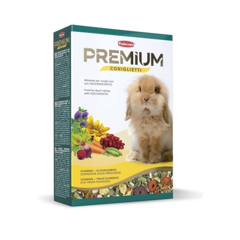 Il Padovan Premium Coniglietti è un alimento secco completo e variegato pensato per conigli nani adulti. La sua formula unisce diverse materie prime lavorate in varie forme, così da stimolare l’appetito e favorire un’alimentazione più completa e appagante. Ogni boccone offre un mix di consistenze e sapori, arricchito con un apporto bilanciato di vitamine e oligoelementi essenziali per supportare le funzioni vitali e rafforzare le difese immunitarie. Il prodotto è studiato per contribuire al mantenimento del peso forma, al benessere intestinale e alla salute generale dell’animale. Grazie alla presenza del coccidiostatico, aiuta inoltre a prevenire i disturbi intestinali causati dai coccidi, particolarmente comuni nei conigli. Il tutto in una confezione salva freschezza che mantiene inalterate le proprietà nutrizionali del prodotto.