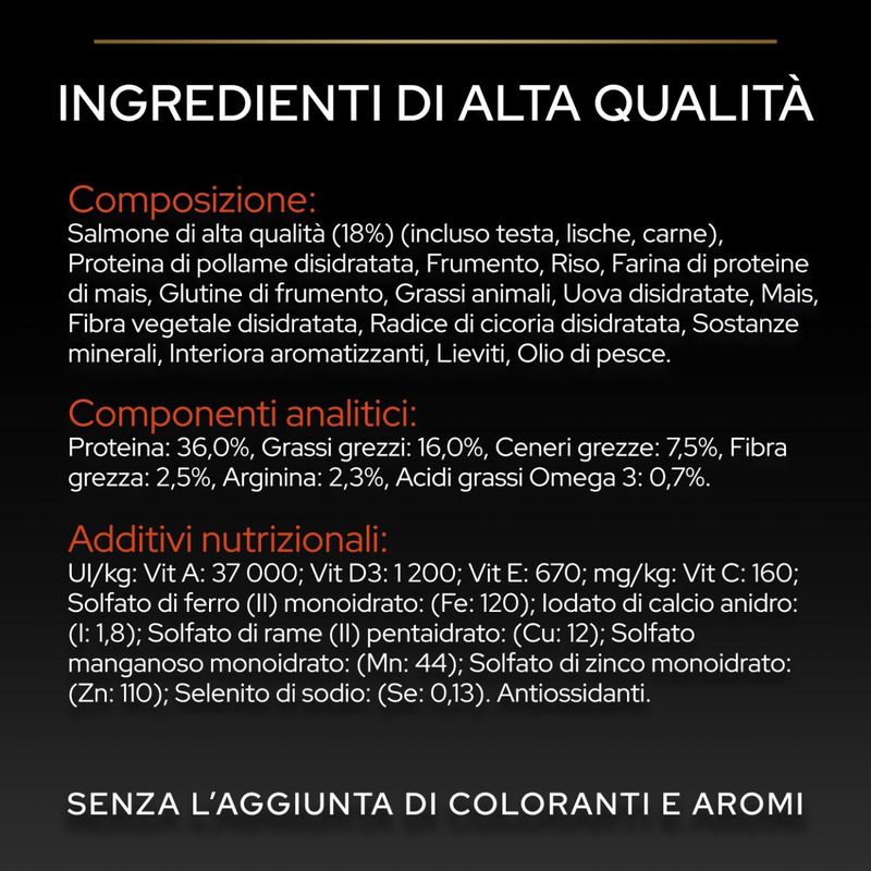 • Contiene il salmone come primo ingrediente e come fonte di proteina animale di alta qualità.