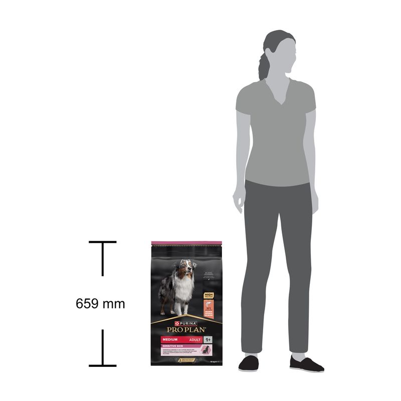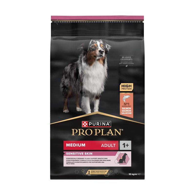 Scegli Purina Pro Plan Sensitive Skin Medium Adult per garantire un' alimentazione quotidiana, sana e ricca di nutrienti importanti, appositamente pensata per il tuo amico peloso.