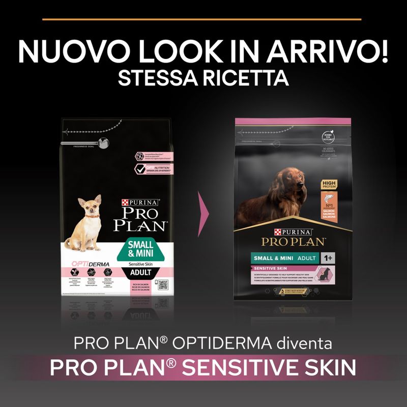 Scegli Purina Pro Plan Sensitive Skin Small e Mini Adult per garantire un' alimentazione quotidiana, sana e ricca di nutrienti importanti, appositamente pensata per il tuo amico peloso.