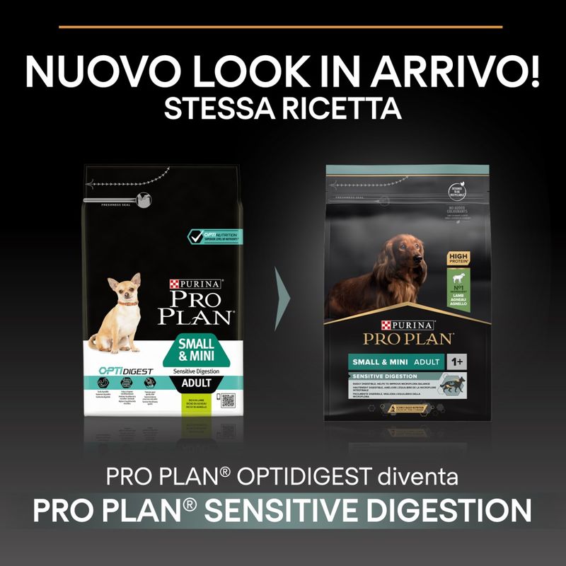 Scegli Purina Pro Plan Sensitive Digestion Small e Mini Adult per garantire un' alimentazione quotidiana, sana e ricca di nutrienti importanti, appositamente pensata per il tuo amico peloso.