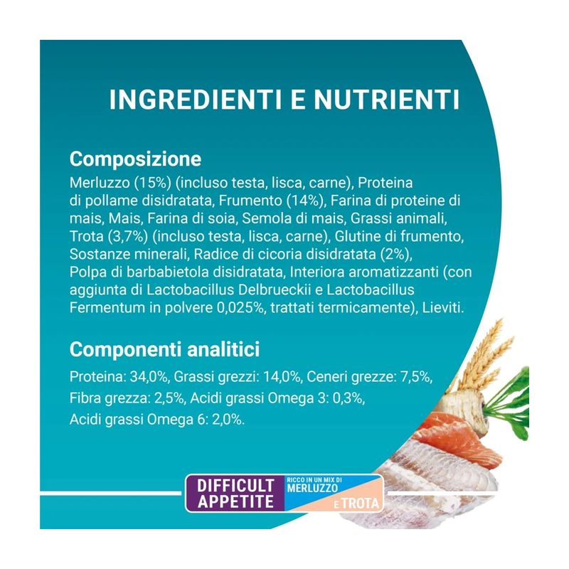 Purina One Gatto Appetito Difficile Merluzzo e Trota è un alimento secco completo appositamente formulato per soddisfare i palati molto esigenti dei gatti adulti. Sviluppato dai veterinari e nutrizionisti Purina, questo cibo contiene, oltre ai batteri funzionali benefici, tutti i nutrienti chiave di cui il tuo gatto necessita per rafforzare le difese naturali dall'interno all'esterno, inclusi gli acidi grassi Omega 6. Grazie a questa formula avanzata, questo alimento offre un approccio integrato per il benessere del tuo gatto, migliorando sia la salute interna che l'aspetto esterno del tuo felino, garantendo una pelle sana e un pelo splendido. Questo prodotto è realizzato senza l'aggiunta di aromi, coloranti o conservanti artificiali, garantendo una dieta naturale e salutare per il tuo felino. Le crocchette contengono proteine di alta qualità, che forniscono una valida fonte di aminoacidi essenziali, fondamentali per supportare un tratto digestivo sano, mantenere una buona massa muscolare e promuovere la vitalità generale del tuo gatto. Contiene il merluzzo come primo ingrediente assicura che il tuo gatto riceva proteine facilmente digeribili e nutrienti, fornendo l'energia necessaria per le attività quotidiane del tuo gatto. La combinazione di questi nutrienti essenziali aiuta a promuovere una pelle elastica e un pelo brillante, migliorando l'aspetto generale del tuo gatto e aiuta anche a mantenere ossa forti e sane grazie all'apporto di minerali e vitamina D, che sono fondamentali per il benessere scheletrico. Inoltre, questo alimento è arricchito con prebiotico cicoria, che favorisce la salute intestinale del tuo gatto supportando la crescita dei batteri buoni nell'intestino. La cicoria è nota per le sue proprietà benefiche sul sistema digestivo, contribuendo a migliorare la digestione e l'assorbimento dei nutrienti.