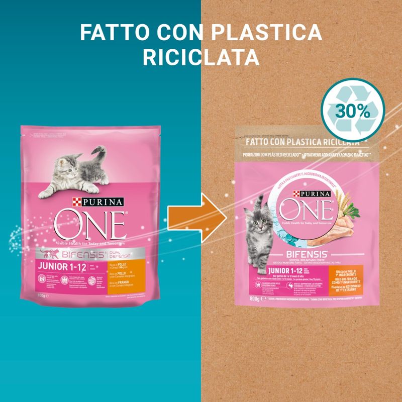 Purina One Gatto Junior Pollo e Cereali è un alimento secco specificatamente formulato per rispondere alle esigenze nutrizionali dei gattini, dallo svezzamento ai 12 mesi, e delle gatte in gestazione o in allattamento. Sviluppato dai veterinari e nutrizionisti Purina, questo cibo contiene, oltre ai batteri funzionali benefici, tutti i nutrienti chiave di cui il tuo bisogno per una crescita sana, inclusi gli acidi grassi Omega 6. Grazie a questa formula avanzata, questo alimento offre un approccio integrato per il benessere del tuo gatto, migliorando sia la salute interna che l'aspetto esterno del tuo piccolo felino, garantendo una pelle sana e un pelo splendido. Questo prodotto è realizzato senza l'aggiunta di aromi, coloranti o conservanti artificiali, garantendo una dieta naturale e salutare per il tuo piccolo amico felino. Le crocchette contengono proteine di alta qualità, che forniscono una valida fonte di aminoacidi essenziali, fondamentali per supportare un tratto digestivo sano, mantenere una buona massa muscolare e promuovere la vitalità generale del tuo gatto. L'inclusione del pollo come primo ingrediente assicura che il tuo gattino riceva un nutrimento ottimale, fornendo tutte le proteine necessarie per una crescita robusta e sana. La combinazione di questi nutrienti essenziali aiuta a promuovere una pelle elastica e un pelo brillante, migliorando l'aspetto generale del tuo gatto e aiuta anche a mantenere ossa forti e sane grazie all'apporto di minerali e vitamina D, che sono fondamentali per il benessere scheletrico. Inoltre, questo alimento è arricchito con prebiotico cicoria, che favorisce la salute intestinale del tuo gattino supportando la crescita dei batteri buoni nell'intestino. La cicoria è nota per le sue proprietà benefiche sul sistema digestivo, contribuendo a migliorare la digestione e l'assorbimento dei nutrienti.