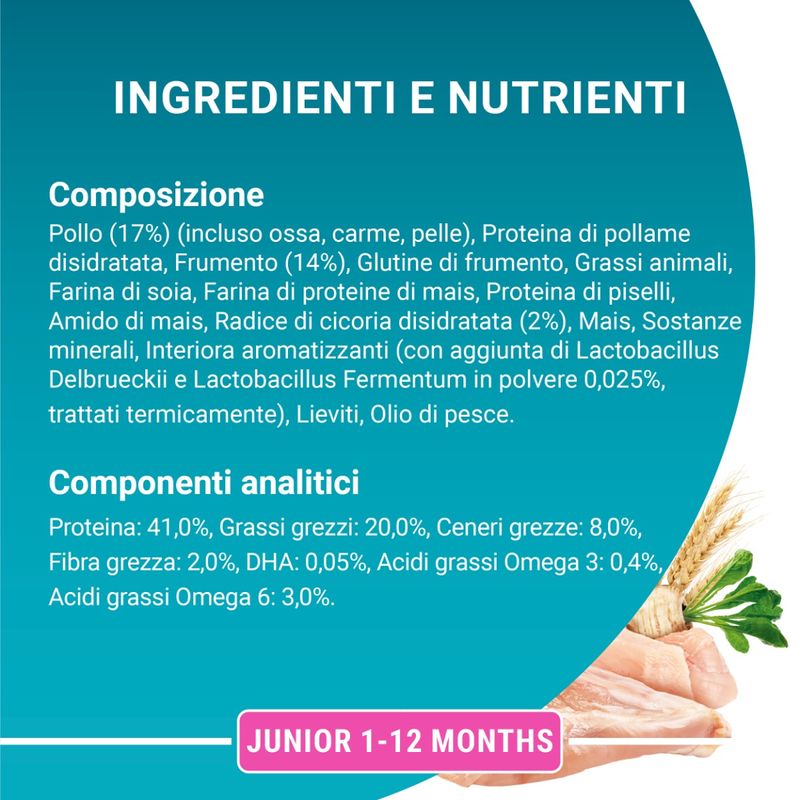 • Contiene proteine di alta qualità provenienti dal pollo.