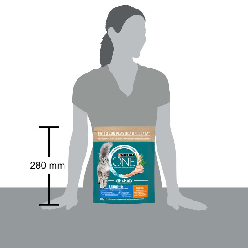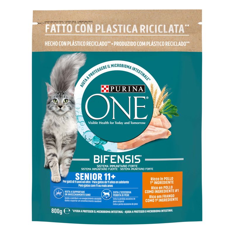 Scegli Purina One Gatto Senior 11+ Pollo e Cereali e offri al tuo gatto anziano una nutrizione completa e bilanciata che supporta la sua salute visibile oggi e domani.