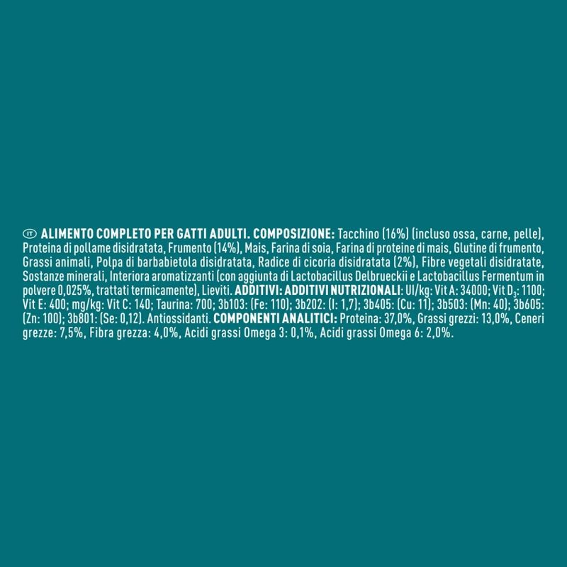 • Contiene proteine di alta qualità provenienti dal tacchino.