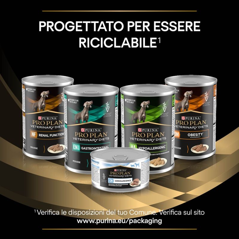 Purina Pro Plan Veterinary Diets En Gastrointestinal Cane è un alimento umido dietetico completo, formulato specificamente per soddisfare le esigenze dei cani con problemi digestivi. Questo cibo umido di qualità Premium è adatto sia per cuccioli che per cani adulti, garantendo un apporto ottimale di nutrienti all'organismo di Fido, anche in presenza di disturbi gastrointestinali. La formula di Purina Pro Plan EN Gastrointestinal è composta da ingredienti altamente digeribili, studiati per non sovraccaricare l'apparato gastrointestinale e favorire una migliore assimilazione dei nutrienti. Grazie alla sua ricetta povera di grassi, questo alimento contribuisce a ridurre al minimo le difficoltà digestive, particolarmente legate alla digestione dei grassi. L'alimento contiene acidi grassi e olio di cocco, noti per la loro facile digeribilità, e racchiude fibre che aiutano a migliorare la consistenza delle feci, supportando così la salute intestinale. Oltre a essere nutrizionalmente bilanciato e di alta qualità, questo alimento è anche molto gustoso e appetibile con formula a mousse assicurando al tuo cane un'alimentazione completa e deliziosa, ideale sia per cuccioli in crescita che per cani adulti.
