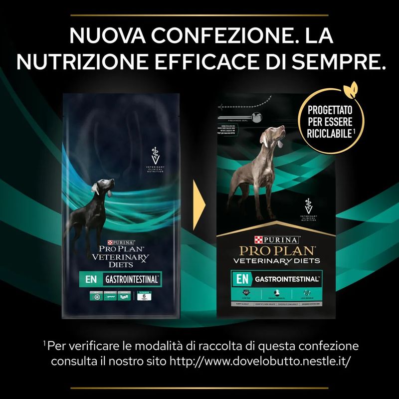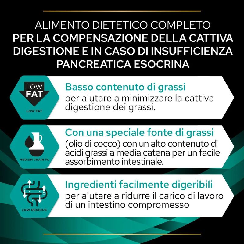 Purina Pro Plan Veterinary Diets En Gastroinestinal Cane è un alimento secco dietetico completo, formulato specificamente per supportare la compensazione della cattiva digestione e per gestire l'insufficienza pancreatica esocrina nei cani. Questo alimento è formulato per trattare disturbi gastrointestinali acuti o cronici, come diarrea, gastroenterite, malassorbimento e maldigestione. È inoltre indicato per cani con insufficienza pancreatica esocrina (EPI), patologie infiammatorie intestinali (IBD), linfangectasia, pancreatite, iperlipidemia, e per epatopatie non associate a encefalopatia. Grazie ai suoi ingredienti altamente digeribili e alla bassa concentrazione di grassi, questo alimento è ideale per cani che necessitano di un supporto nutrizionale specifico per problemi gastrointestinali. Questo prodotto è particolarmente indicato anche per la riduzione dei disturbi acuti dell'assorbimento intestinale, offrendo un livello accresciuto di elettroliti e ingredienti ad elevata digeribilità per favorire un rapido recupero e una migliore assimilazione dei nutrienti. Il prodotto presenta un basso livello di trigliceridi a lunga catena (LCT), prevenendo la maldigestione dei grassi, mentre l'aggiunta di trigliceridi a media catena (MCT) offre una fonte di energia facilmente digeribile e assorbibile. Gli acidi grassi Omega-3 sono inclusi per coadiuvare il trattamento dell'infiammazione.