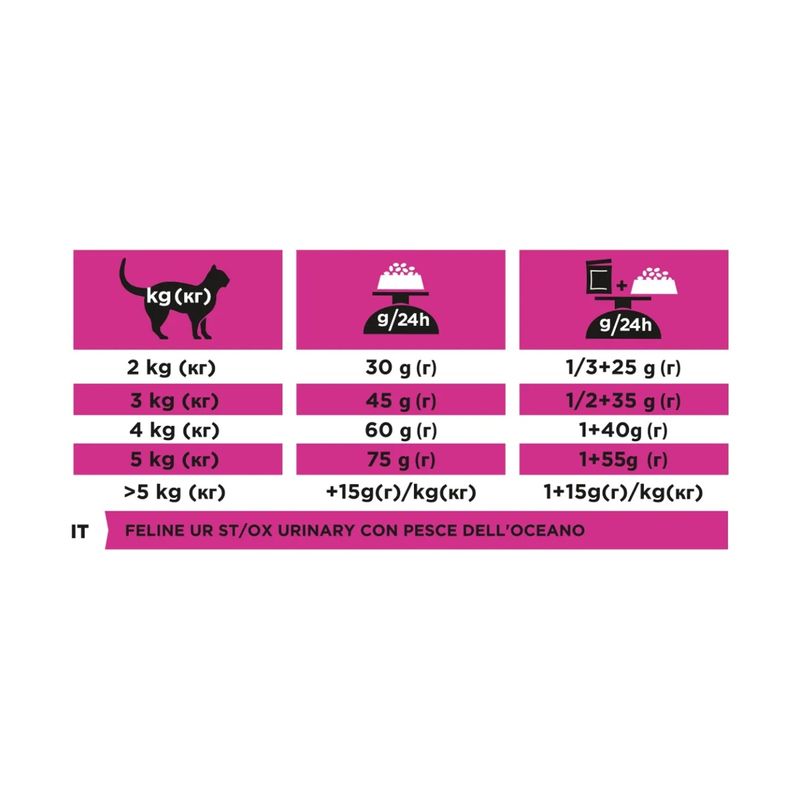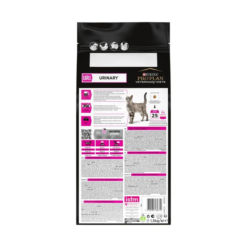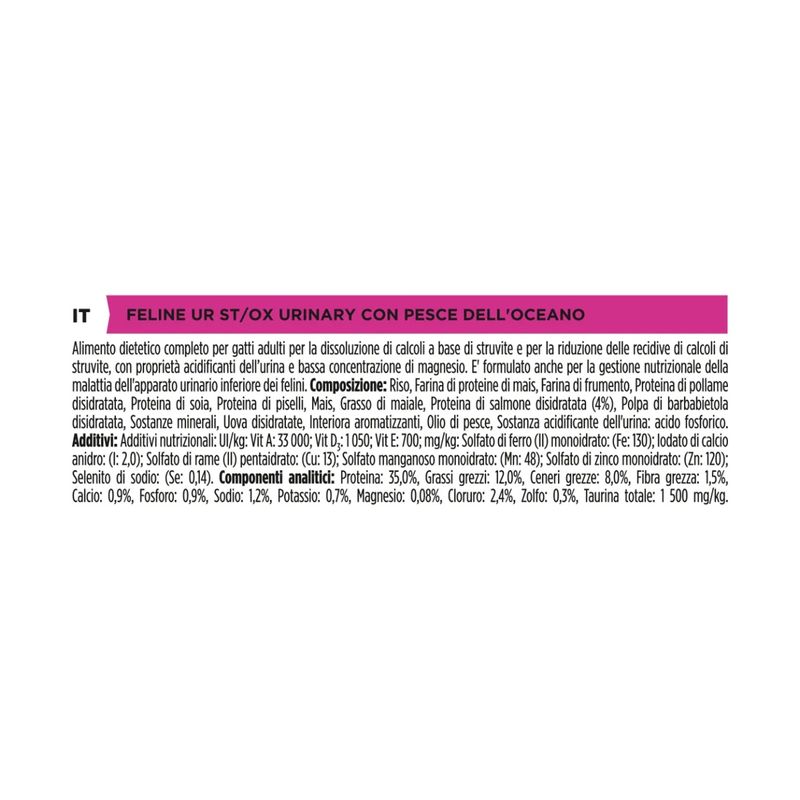 Purina Pro Plan Veterinary Diets Ur Urinary al Pesce per Gatto è un alimento dietetico completo pensato per i gatti adulti, progettato per supportare la salute del tratto urinario e prevenire problemi urinari comuni. Questo cibo è particolarmente utile nella dissoluzione dei calcoli a base di struvite e per ridurre il rischio di recidive di calcoli urinari. I calcoli di struvite possono formarsi nel tratto urinario dei gatti, causando dolore, difficoltà a urinare e, nei casi più gravi, infezioni o ostruzioni che richiedono un trattamento veterinario urgente. La formula è anche indicata per la gestione nutrizionale di gatti che soffrono di disturbi del tratto urinario inferiore, una condizione che può comportare sintomi come sangue nelle urine, frequente bisogno di urinare o difficoltà a farlo. Questo alimento aiuta a mantenere il pH urinario in equilibrio, creando un ambiente favorevole a prevenire la formazione di calcoli e riducendo il rischio di infiammazioni o infezioni.