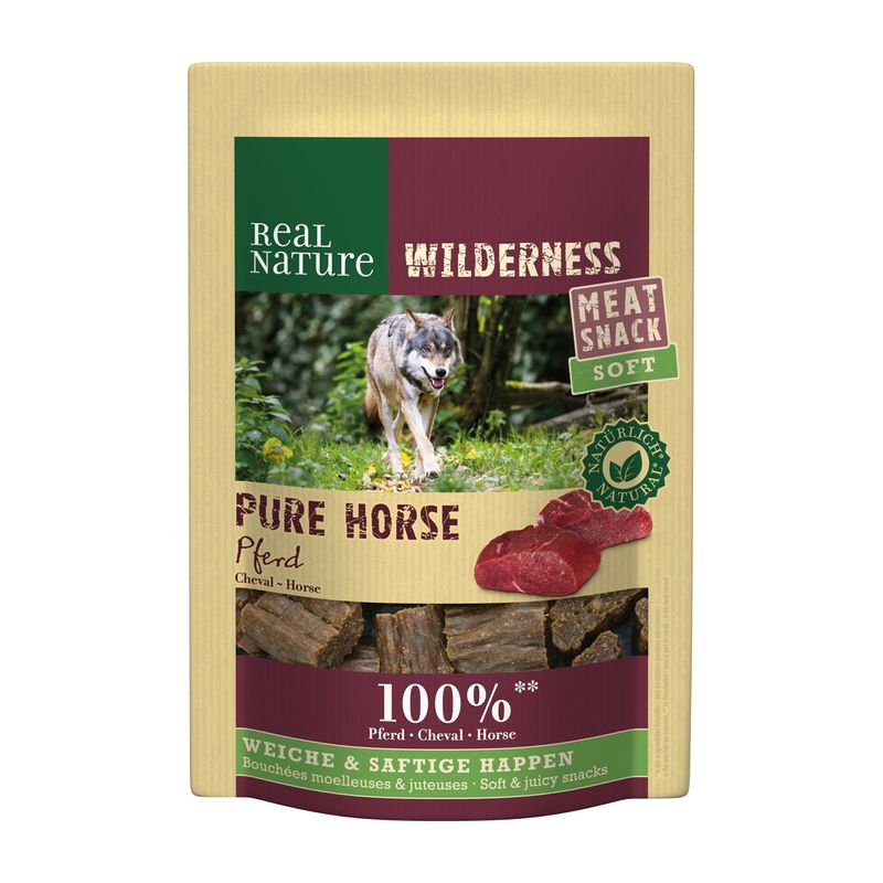 Real Nature Wilderness Dog Meat Snack Soft 150G gustosi bocconcini morbidi e succosi pensati per premiare con gusto e delicatezza cani adulti di tutte le taglie, anche i più sensibili. Disponibili nelle deliziose varianti con pollo fresco, cavallo o manzo come unica fonte proteica, questi snack sono realizzati esclusivamente con ingredienti naturali. Completamente privi di cereali, conservanti, coloranti, aromi artificiali, stimolanti dell'appetito ed esaltatori di sapore, rappresentano uno snack ideale per favorire la salute del tuo cane e preservare una digestione ottimale. L'elevato contenuto proteico garantisce una muscolatura forte e un apporto energetico equilibrato, mantenendo il tuo cane sano e in forma.