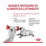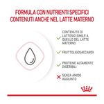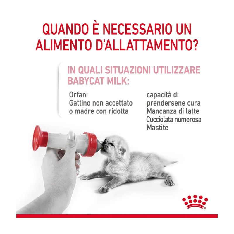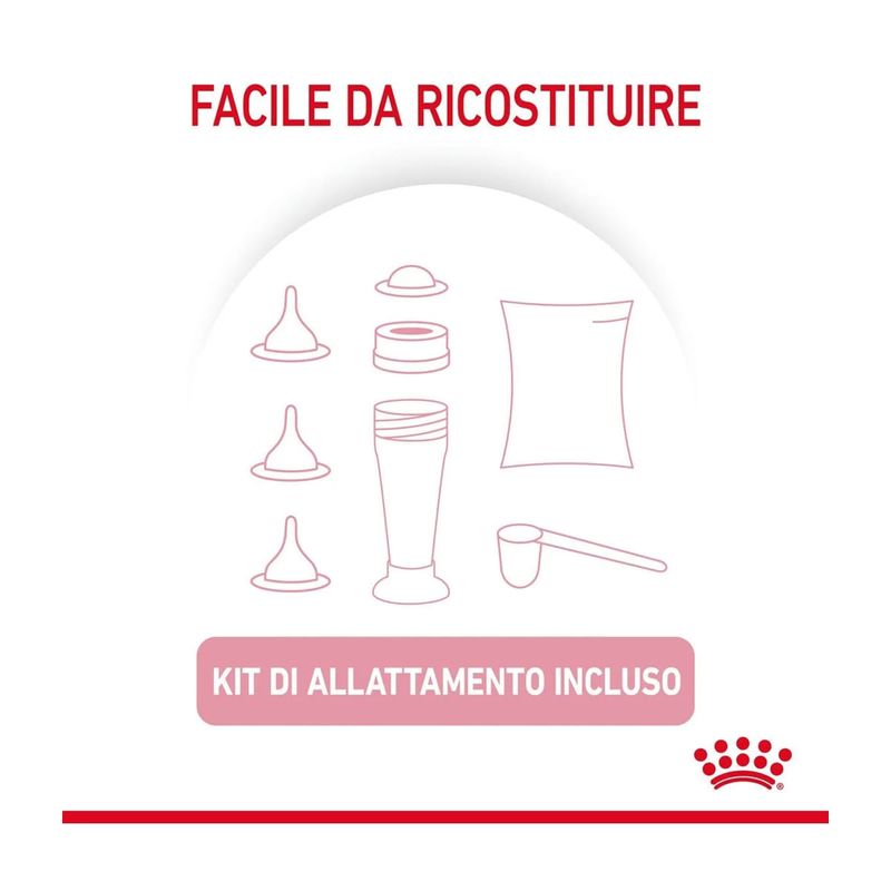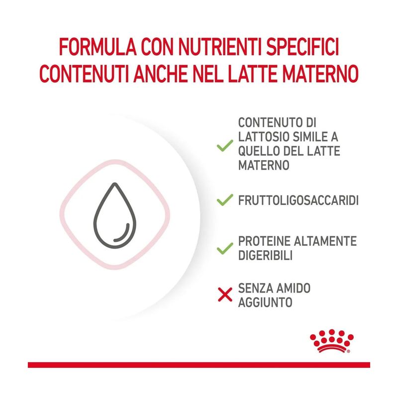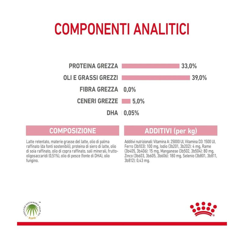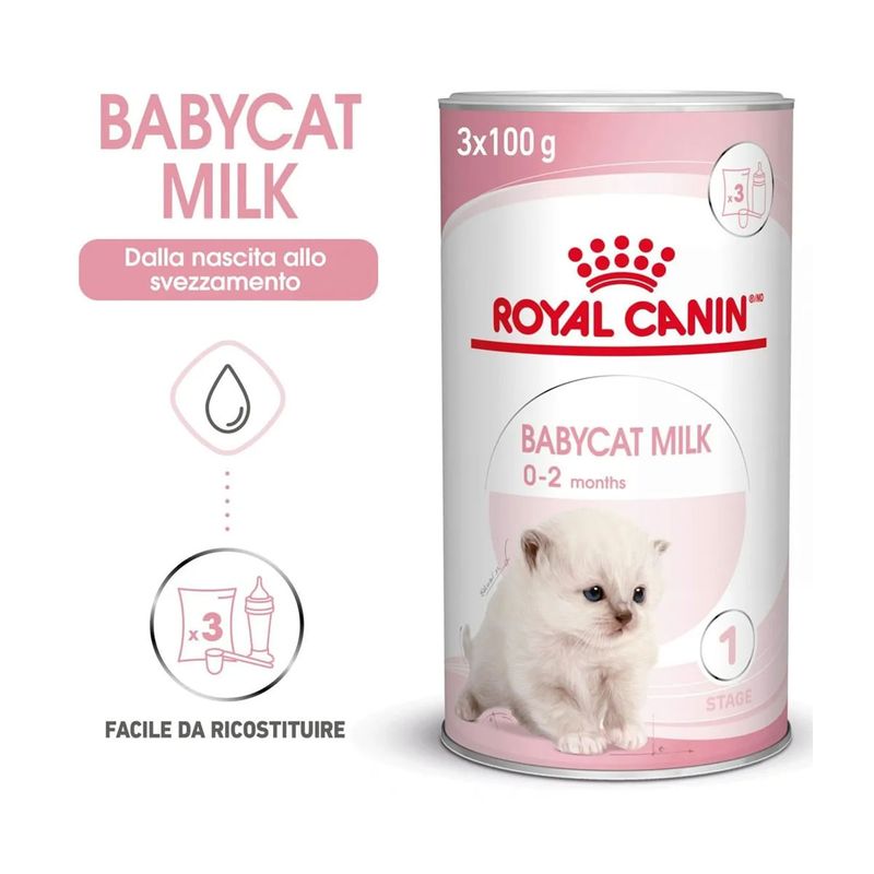 Royal Canin Babycat Milk è un sostituto del latte materno formulato per l'alimentazione dei gattini dalla nascita allo svezzamento, specialmente indicato in caso di insufficienza o scarsa qualità del latte materno. La combinazione di prebiotici e proteine altamente digeribili aiuta a promuovere un sano equilibrio del microbiota intestinale. Questa formula supporta la crescita e la salute digestiva grazie ad un contenuto adattato di lattosio e all'assenza di amido, risultando particolarmente indicata per l'apparato digerente del micetto. La sua formulazione è stata progettata per ricreare i nutrienti presenti naturalmente nel latte materno, fornendo al cucciolo il supporto necessario per uno sviluppo sano. Una caratteristica importante di Royal Canin Babycat Milk è la sua facilità di preparazione: si dissolve istantaneamente, creando un sostituto del latte totalmente omogeneo. Questo facilita l'alimentazione dei piccoli essendo più comoda per i proprietari, e rendendola facile da ricostruire, assicurando allo stesso tempo che ricevano tutti i nutrienti necessari per una crescita sana. Inoltre, la ricetta è arricchita con un acido grasso essenziale Omega-3 chiamato DHA che è naturalmente presente nel latte materno e svolge un ruolo nel supportare lo sviluppo cerebrale del gattino. Infatti dopo la nascita del gattino, lo sviluppo cerebrale e quello e delle difese naturali continuano.