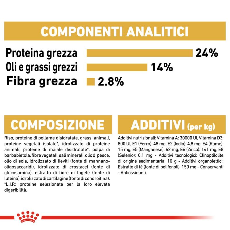 Gli alimenti Royal Canin si distinguono per la loro precisione nutrizionale, evidente in ogni aspetto, dalla forma e dimensione delle crocchette alle diverse consistenze e appetibilità degli alimenti umidi. L'approccio distintivo di Royal Canin è basato su una nutrizione su misura, precisa e completa, offrendo diverse gamme di alimenti completi progettati per soddisfare specifici bisogni legati all'età, alla taglia, alla razza o a particolari sensibilità del tuo amico a quattro zampe. Ciascuna formula è appositamente sviluppata per fornire un livello adattato di nutrienti strategici, come antiossidanti, vitamine, fibre, prebiotici e sali minerali, al fine di promuovere la salute di ogni animale domestico.