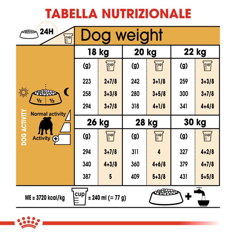 I Bulldog non sono particolarmente attivi come altre razze canine e hanno livelli di energia piuttosto ridotti quindi la formulazione delle crocchette garantisce un apporto adattato di energia grazie a un contenuto calorico moderato. Inoltre è arricchito con acidi grassi Omega-3 (EPA e DHA) che contribuiscono alla