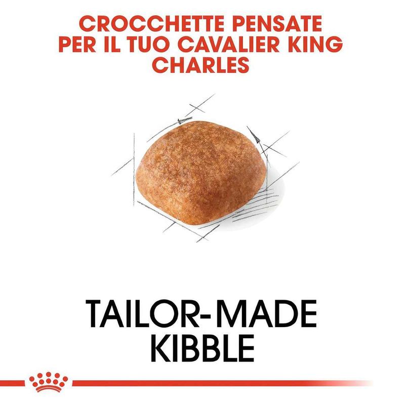 Il Cavalier King Charles è una razza moderatamente brachicefala e pertanto una crocchetta dalla forma adattata a quella della sua mascella gli permette una masticazione efficace.
