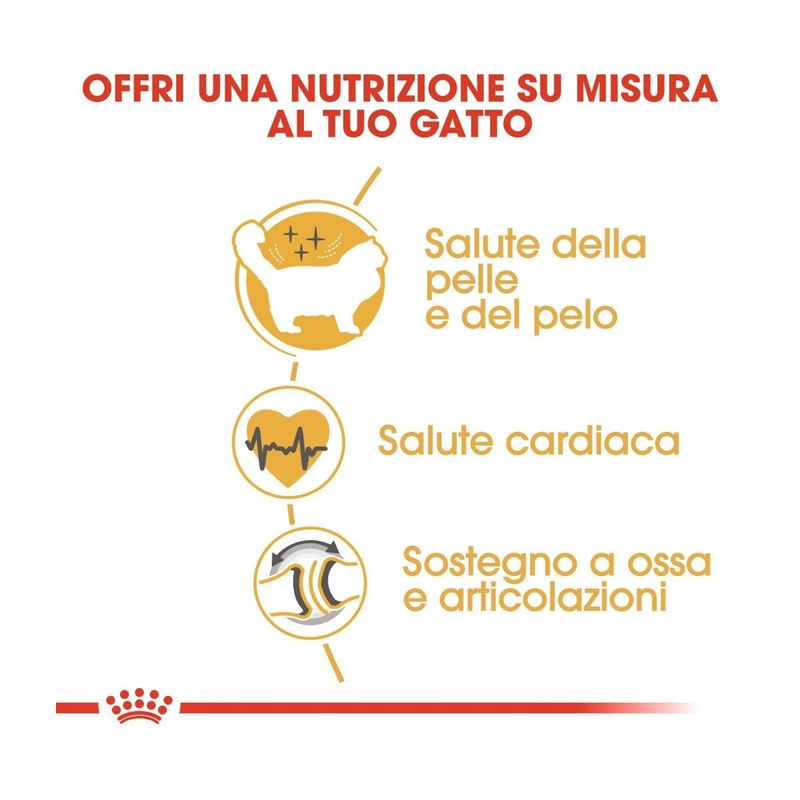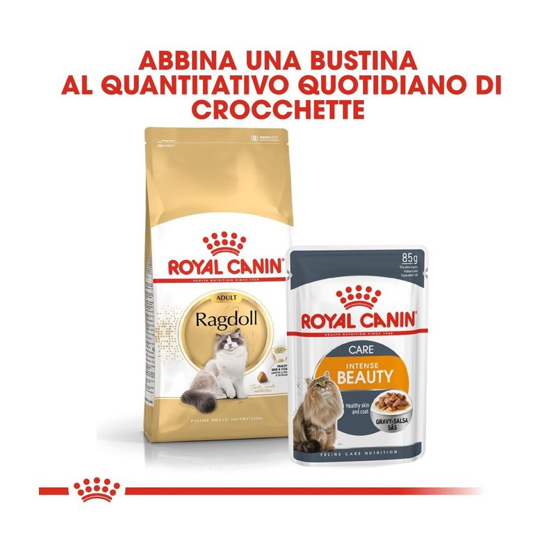 Royal Canin Ragdoll Alimento completo secco per gatti adulti, pensato appositamente per il tuo adorabile gatto adulto Ragdoll. La sua crocchetta esclusiva a forma di piramide è studiata per adattarsi perfettamente alla speciale mascella ampia della razza, facilitando la presa e favorendo una corretta masticazione. Ricco di aminoacidi, vitamine e acidi grassi Omega 3 e Omega 6, questo alimento sostiene una pelle sana e un pelo morbido e brillante. La taurina, insieme agli acidi grassi EPA e DHA, supporta il benessere cardiaco, proteggendo la salute del cuore del tuo gatto adulto. Inoltre, grazie al perfetto equilibrio di sali minerali, aiuta a mantenere in salute il tratto urinario, favorendo il corretto funzionamento del sistema urinario.