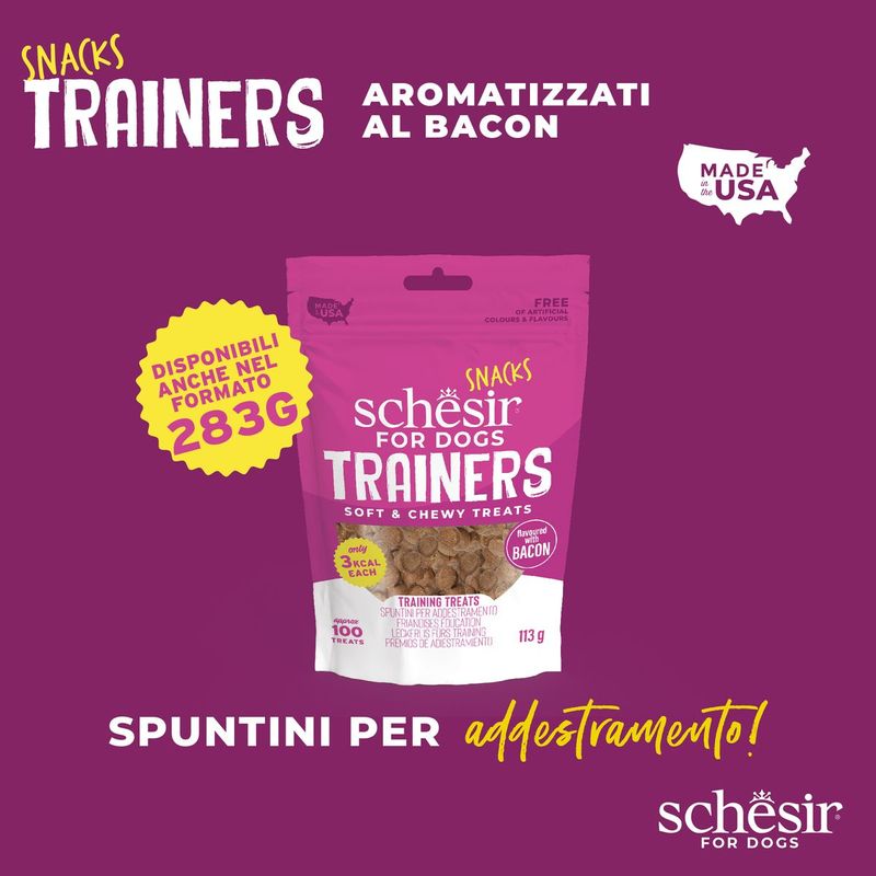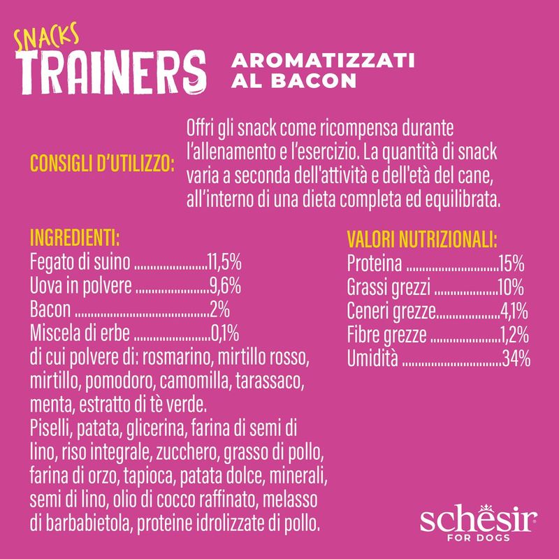 Schesir Snack Dog Training Bacon, rendi ogni momento di addestramento un'occasione per rafforzare il legame con il tuo tesoro e promuovere il suo benessere.