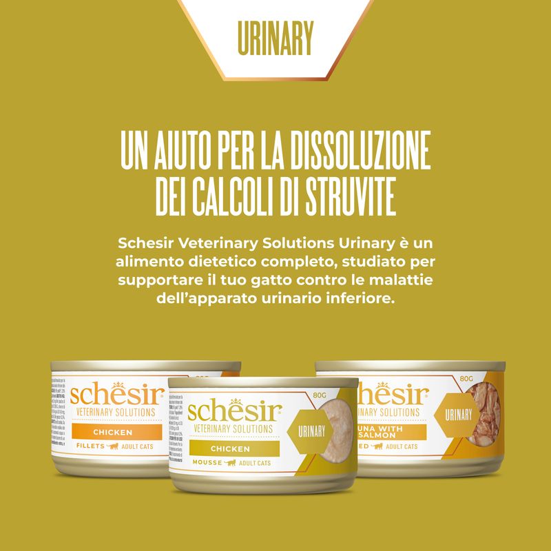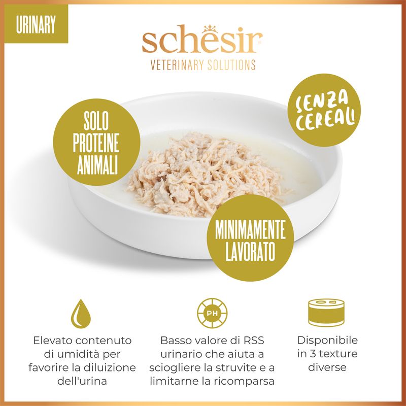Con Schesir Veterinary Solutions Urinary Cat Lattina Multipack 3x80G, supporti il tuo gatto con un prodotto mirato, naturale e altamente appetibile, per una vita sana e serena.