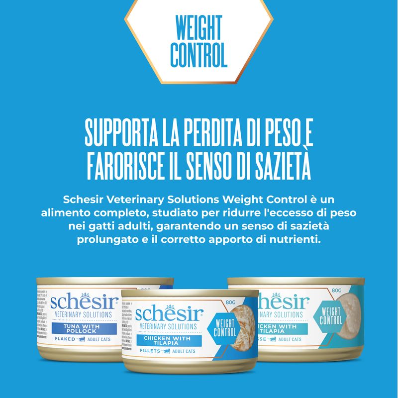 Con Schesir Veterinary Solutions Weight Control Cat Flaked Lattina 80G, supporti il tuo gatto con un prodotto mirato, naturale e altamente appetibile, per una vita sana e serena.