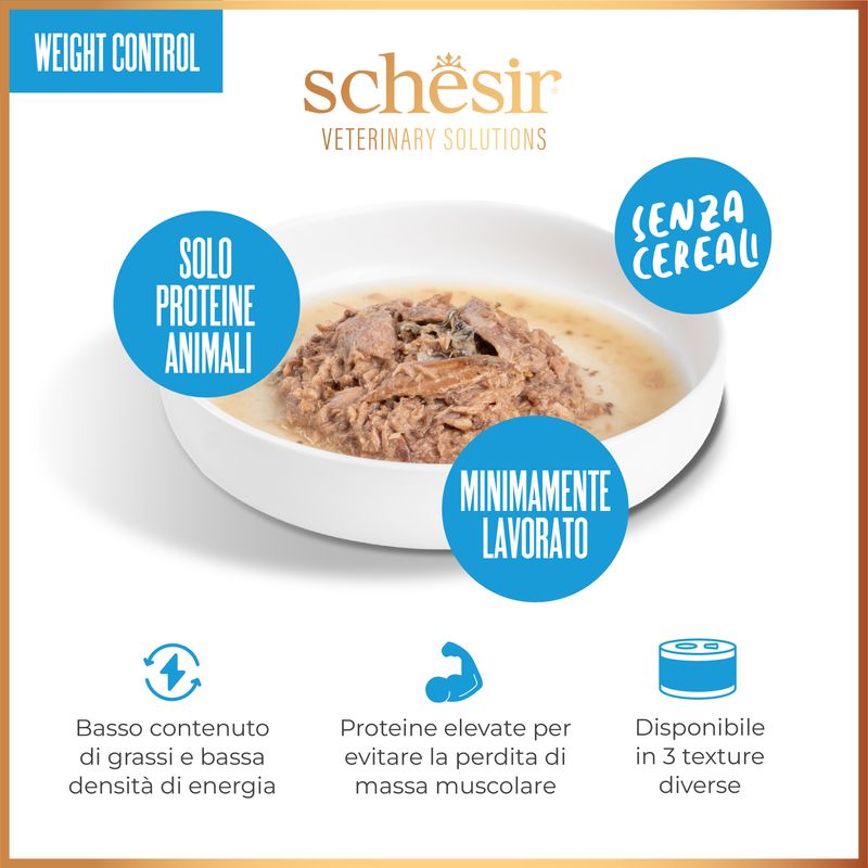 Schesir Veterinary Solutions Weight Control Cat Lattina Multipack 3x80G è un alimento umido dietetico completo ed equilibrato, appositamente formulato per aiutare i gatti adulti a ridurre l'eccesso di peso corporeo in modo sano e bilanciato. Pensato per garantire un'alimentazione controllata senza rinunciare al gusto, questo prodotto è ideale per i gatti che necessitano di un regime alimentare mirato. Questo alimento grain free, privo di cereali, è realizzato con ingredienti naturali e di alta qualità selezionati per garantire una nutrizione ottimale e per soddisfare le esigenze dei gatti in sovrappeso o con tendenza a ingrassare, aiutandoli a ritrovare il loro peso forma. Questa prelibatezza contiene un basso contenuto di grassi e bassa densità energetica, per favorire una perdita di peso graduale e controllata. Con un’alto contenuto proteico, per preservare la massa muscolare magra durante il dimagrimento. Elevata idratazione, indispensabile per mantenere il benessere generale del gatto e supportare la funzione renale e fibre insolubili, che contribuiscono a migliorare il senso di sazietà, aiutando a ridurre la sensazione di fame tra i pasti. Questo prodotto offre 2 gusti irresistibili in 3 diverse texture, per soddisfare ogni preferenza del tuo gatto. Ogni lattina da 80G è studiata per fornire un pasto completo e appagante, combinando il gusto con la funzionalità. La praticità del multipack da 3 lattine consente di garantire una fornitura costante per il tuo gatto, assicurandogli un alimento che contribuisce al suo benessere quotidiano e al mantenimento del peso ottimale.