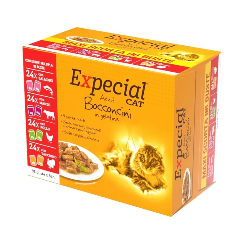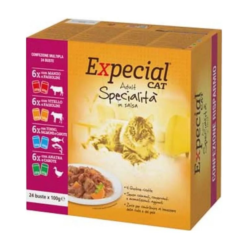 Sorprendi il tuo gatto con il meglio della varietà firmata Expecial! Il Set Prova Multigusto 24x100G e 96x85G Expecial Cat Multipack è tutto ciò che serve per un’alimentazione sana, buona e mai noiosa!
