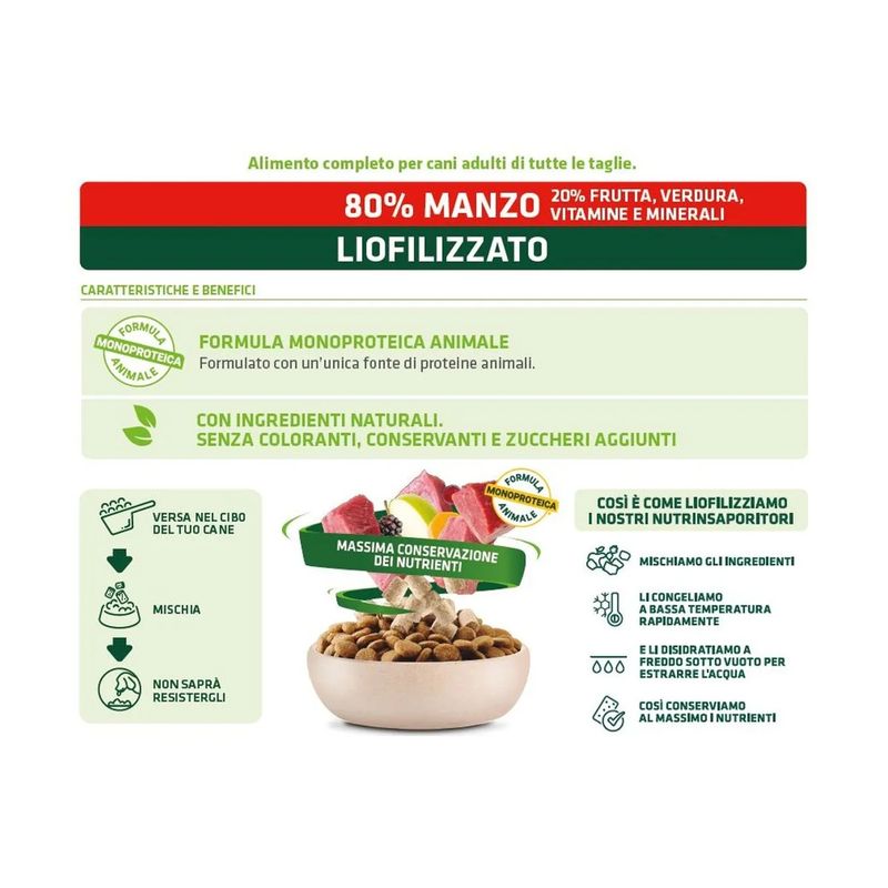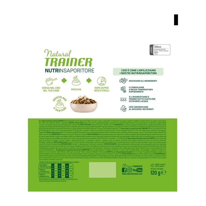 Il Set Prova Multigusto 4x120G Natural Trainer Dog NutrInsaporitore è un insaporitore formulato al 100% carne liofilizzata, sano e naturale dedicato al tuo cane adulto. Formulato con un’unica fonte di proteine animali. Contiene l'80% di carne e il 20% di frutta, verdura, vitamine e minerali, indispensabili per la salute del tuo amico peloso. Con ingredienti naturali, senza coloranti, conservanti e zuccheri aggiunti. Il processo della liofilizzazione avviene cosi: si tagliano tutti gli ingredienti presenti nella ricetta, dopo vengono congelati a bassa temperatura rapidamente, successivamente vengono disidratati a freddo sotto vuoto per estrarne l'acqua. Facendo così si conservano tutti i nutrienti degli ingredienti. Questo insaporitore è un modo per rafforzare il legame tra te e il tuo amico peloso. Può essere usato come ricompensa o come coccola tra un pasto e l’altro.