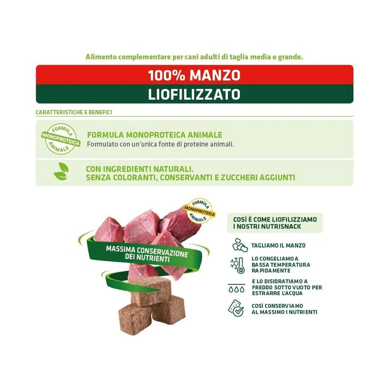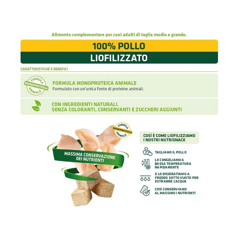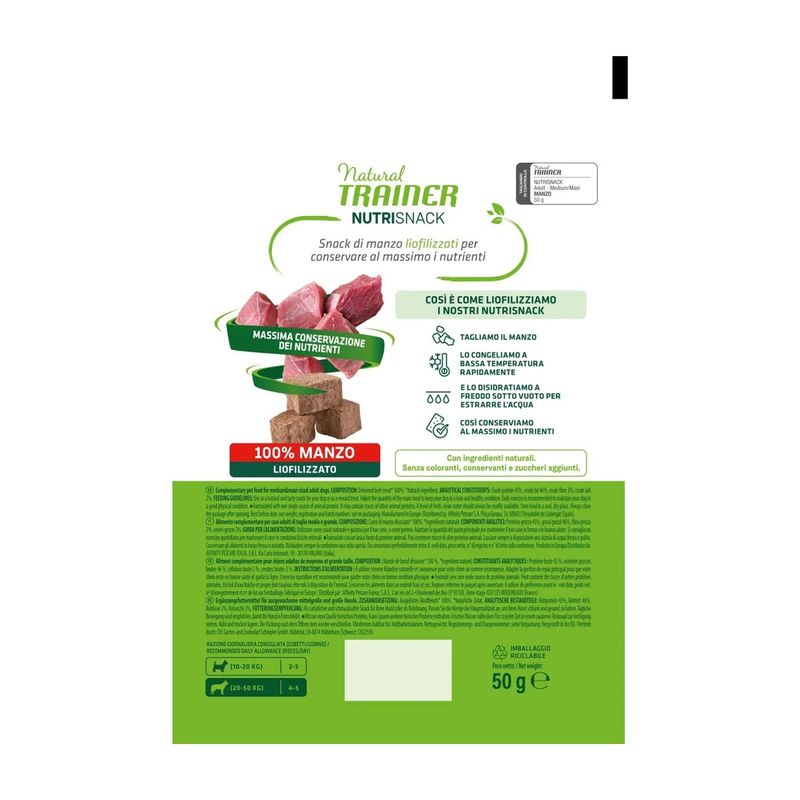 Il Set Prova Multigusto 4x50G Natural Trainer Dog Nutri Snack è un delizioso snack croccante formulato al 100% con carne liofilizzata, sano e naturale dedicato al tuo cane adulto. Formulato con un’unica fonte di proteine animali. Con ingredienti naturali, senza coloranti, conservanti e zuccheri aggiunti. Il processo della liofilizzazione avviene cosi: si taglia la carne, dopo viene congelata a bassa temperatura rapidamente, successivamente viene disidratata a freddo sotto vuoto per estrarre l'acqua. Facendo così si conservano tutti i nutrienti della carne. Lo snack è un modo per rafforzare il legame tra te e il tuo amico peloso. Può essere usato come ricompensa o come coccola tra un pasto e l’altro.