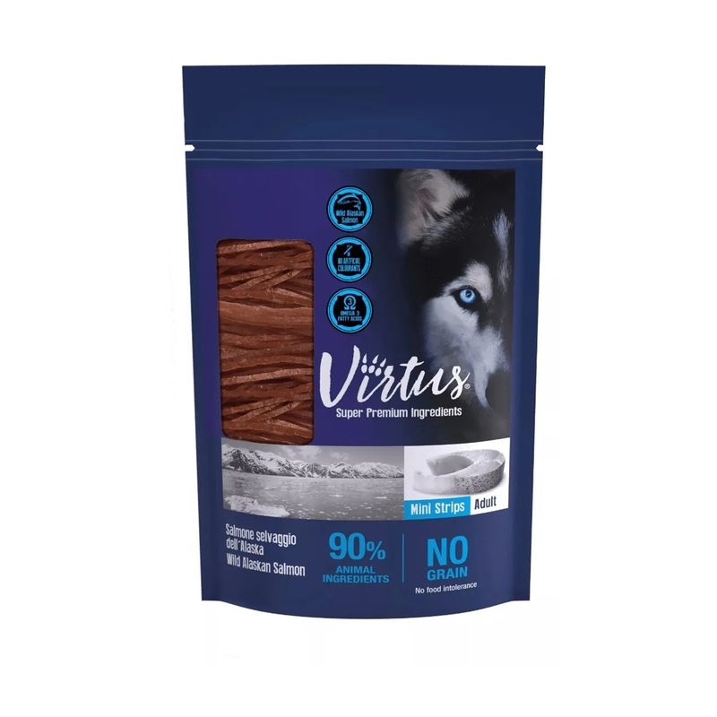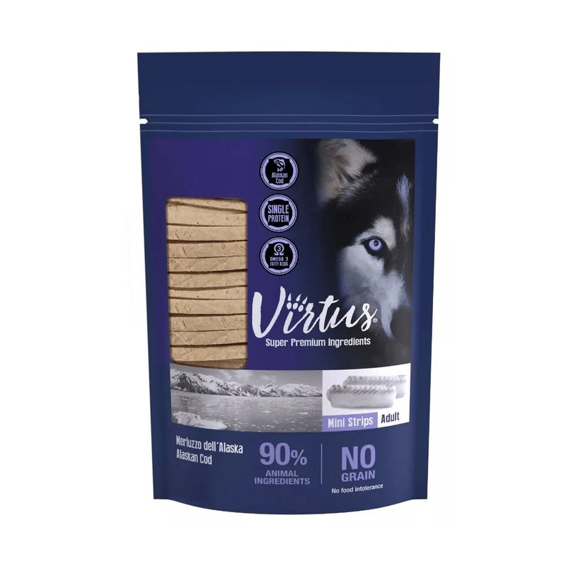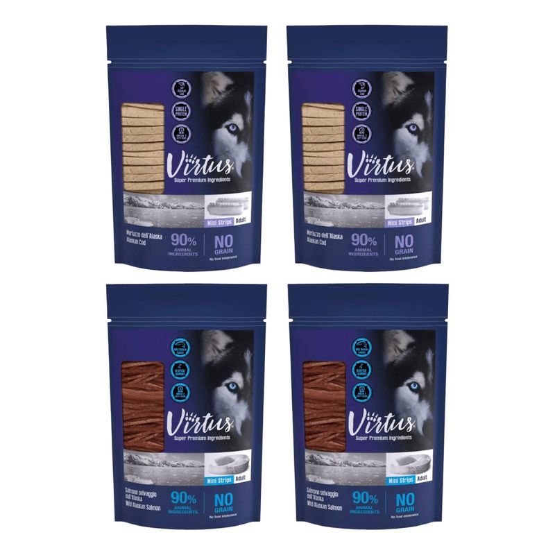 Il Set Prova Multigusto 4x90G Virtus Dog Snack Mini Strips sono deliziose fettine sottili, perfette come premio quotidiano o spuntino gustoso. Appartengono alla categoria snack e sono ideali per cani adulti. Disponibili in due varianti, con merluzzo dell’Alaska (90% di ingredienti animali) o salmone selvaggio (88%), questi snack sono altamente proteici e poveri di grassi, ideali per mantenere la forma fisica del cane anche tra un pasto e l’altro. Ricchi di Omega 3, contribuiscono alla salute della pelle e del pelo e favoriscono un cuore sano. La formula è semplice ma efficace: solo ingredienti naturali e selezionati, completamente senza cereali, coloranti e conservanti, per offrire uno snack gustoso ma anche delicato per i cani più sensibili.